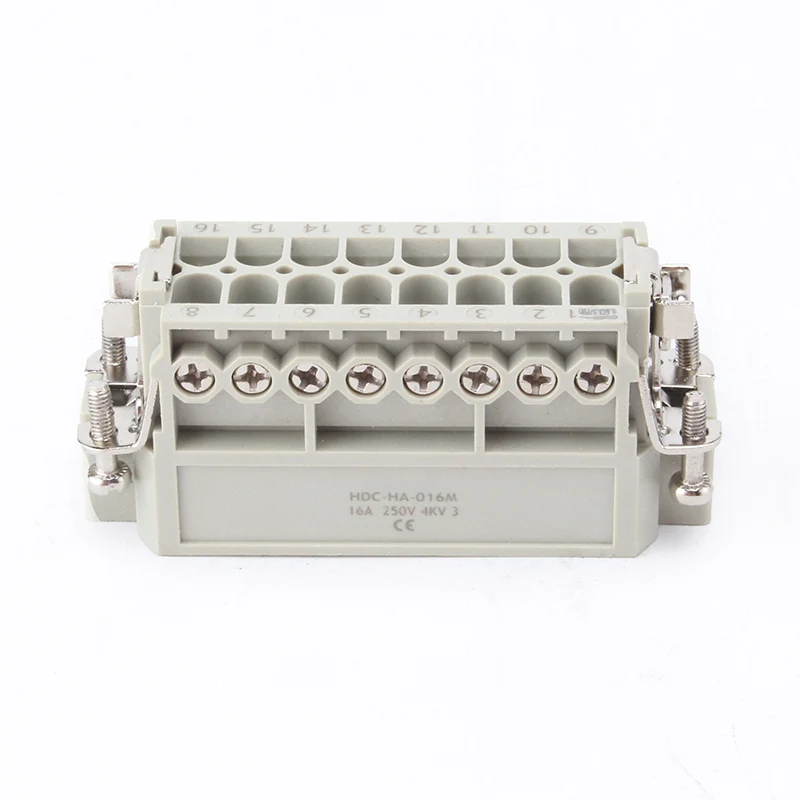 16А 10 Пин Инсерт Хеави Дути конектори су женски и мушки инертни делови. ХА-016-М и ХА-016-Ф су мушки и женски део, слажу се у комплету. Они раде заједно са алуминијумским кућиштем Х16А. Компоненте уметка и спољашње кућиште заједно чине комплетан производ конектора. Направљене су од ПЦ шкољке и месинганих иглица са посребреним лимом. Посребрене игле омогућавају добре електричне везе.