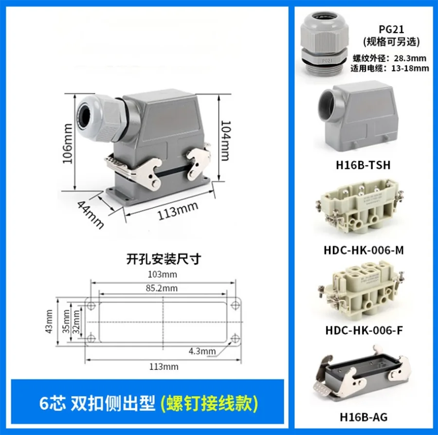 80А 4+2 Пин Инсерт Хеави Дути конектор је обрађен Х16Б-ТСХ алуминијум Кућиште конектора за тешке услове рада. Направљена је од чврстог ПЦ материјала и месинганог посребреног .ЦХТАР месинганих иглица су пресвучене сребром што је доброг квалитета и боље електричне проводљивости. Садржи заптивну гуму која га чини добром водоотпорном карактеристиком.