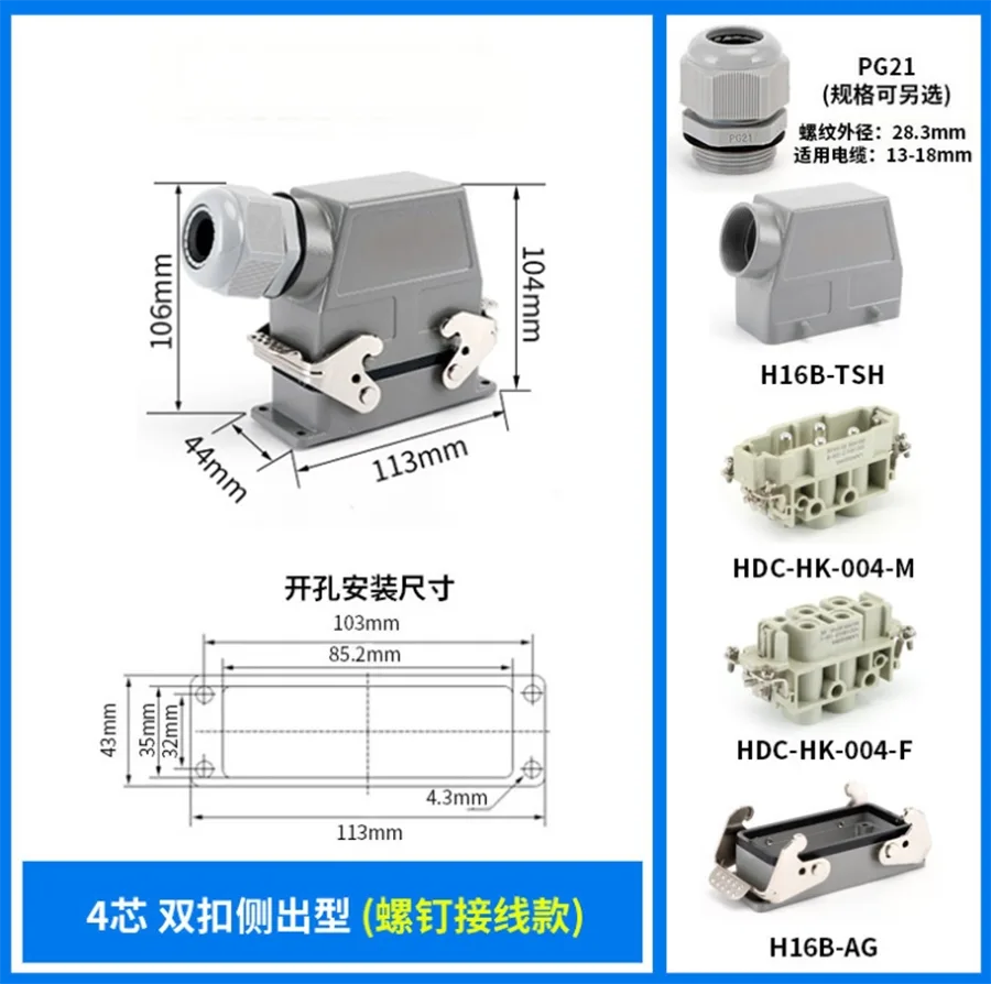 ХК-004/0-М ХК Конектори за тешке услове рада раде испод струје од 80А. Има 4 игле за контакт са жицама. Нуди се за различите услове рада и популарно се користи у аутоматским индустријама и врстама ожичења машина.