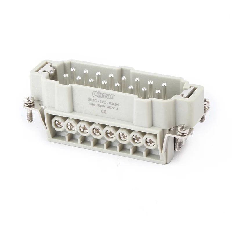 М/Ф 16 Пин Инсерт Хеави Дути конектори су уметнути делови који се монтирају у алуминијумско кућиште конектори за тешке услове рада ХДЦ-ХЕ-016. Уметни конектори за тешке услове рада су направљени од ПЦ и месинганих пинова. ЦХТАР месингане игле су посребрене. Мушки и женски делови су повезани заједно. Такође је потребно да се монтира у део кућишта да би били заштићени ИП65.