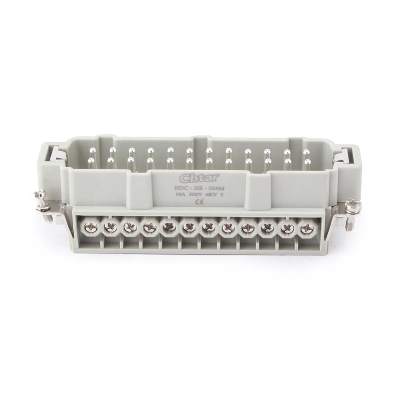 М/Ф 24 Пин Инсерт Хеави Дути конектори су уметнути делови конектора за тешке услове рада ХДЦ-ХЕ-024. Направљени су од ПЦ и месинганих игле. Делови уметака и алуминијумски делови кућишта су састављени као комплетан сет конектора за тешке услове рада. Делови за уметање су у функцији електричног повезивања, а алуминијумско кућиште је заштићено деловима уметака. Има заштиту до ИП65.