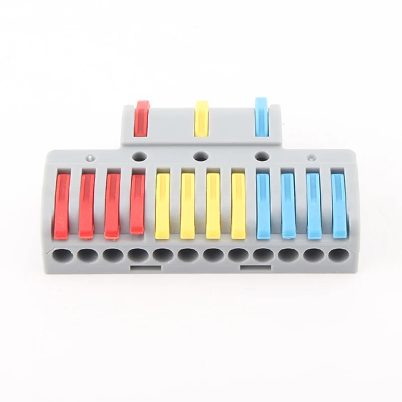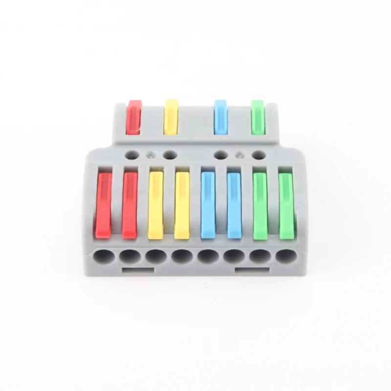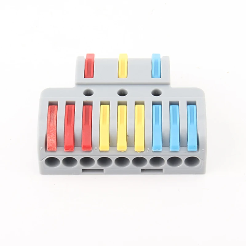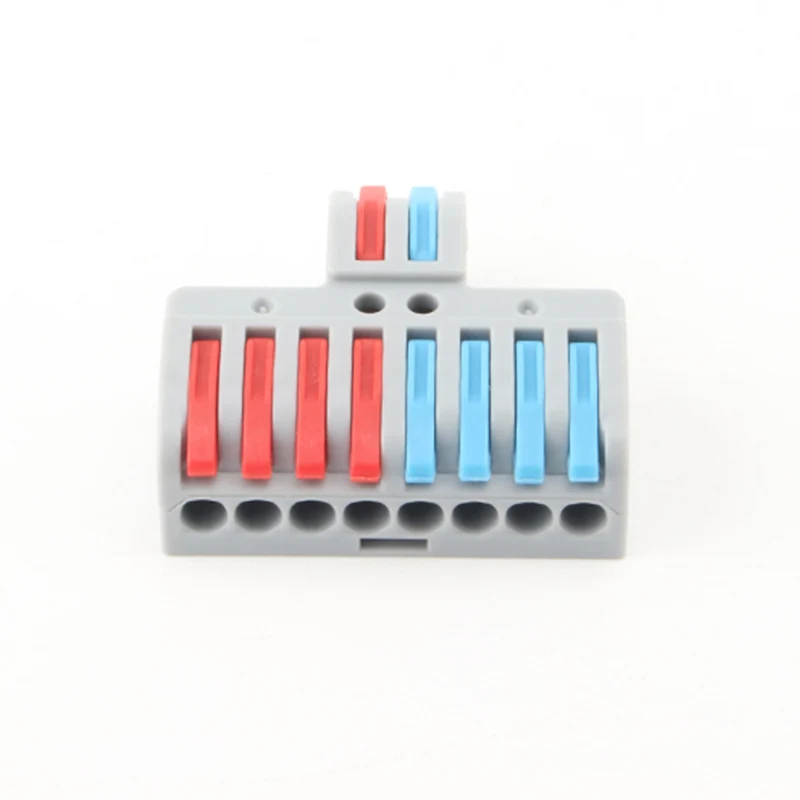 Брзи конектори за жице за спајање са више улаза и више излаза класичан изглед производа, преграде ручке различитих боја остварују разлику у правцу ожичења производа. Обавестите кориснике јасније како да повежу линије гранања. Пробна рупа резервисана на врху производа омогућава купцима да тестирају перформансе по укључењу након ожичења.