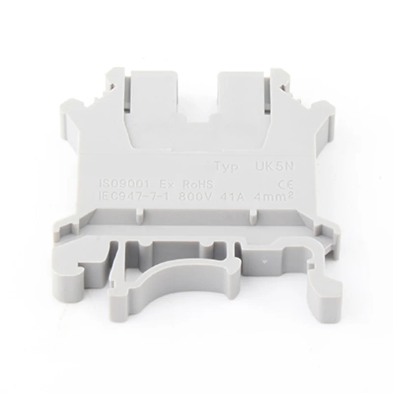 Наш УК 5Н вијчани Дин шински терминални блок је направљен од најлонског материјала за кућиште УЛ94 В0. Проводна је од бакра а оквир од месинга, вијци су од челика.